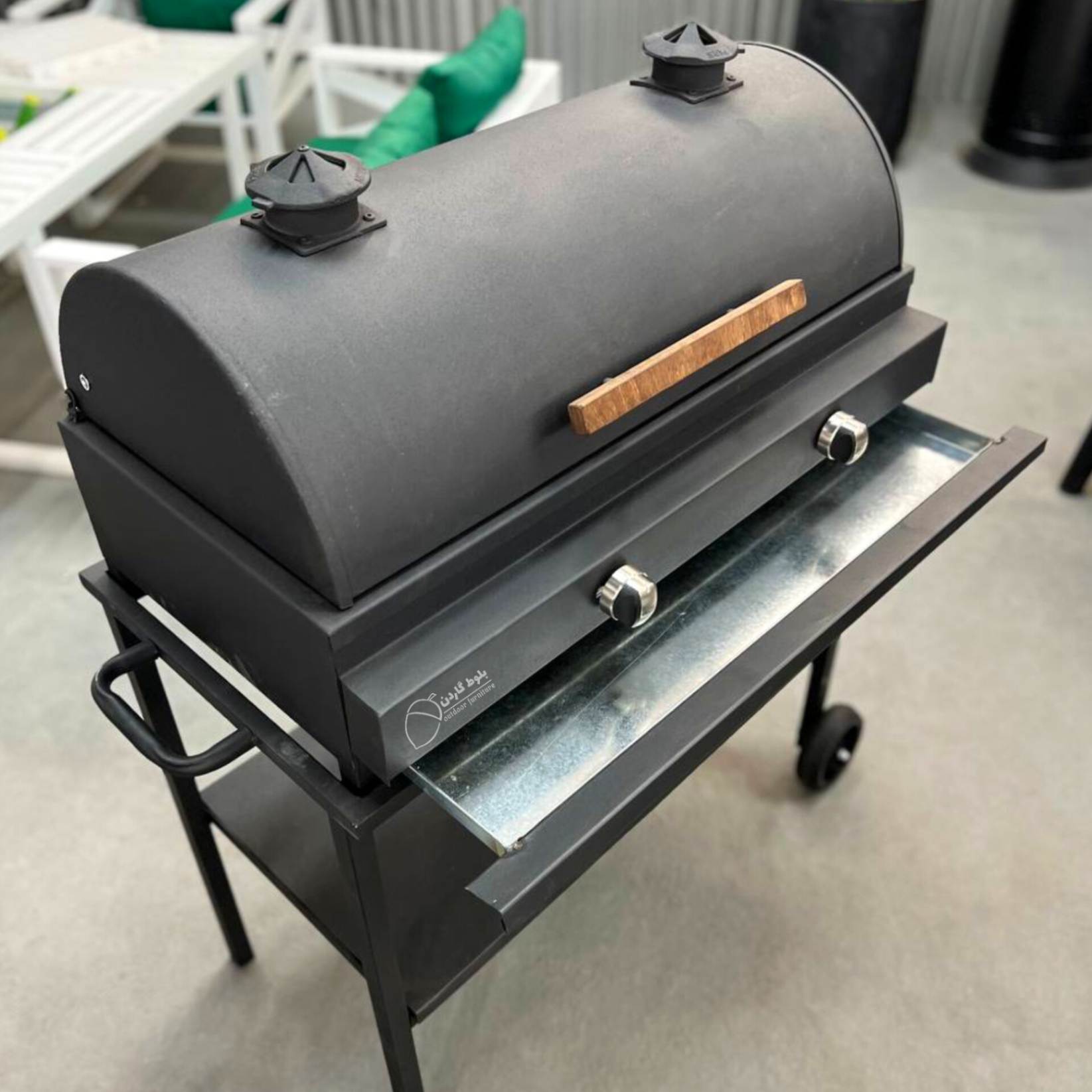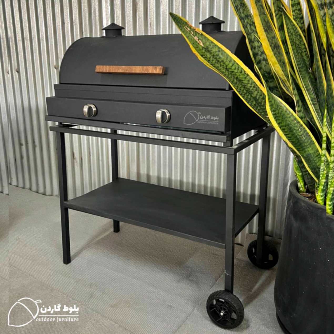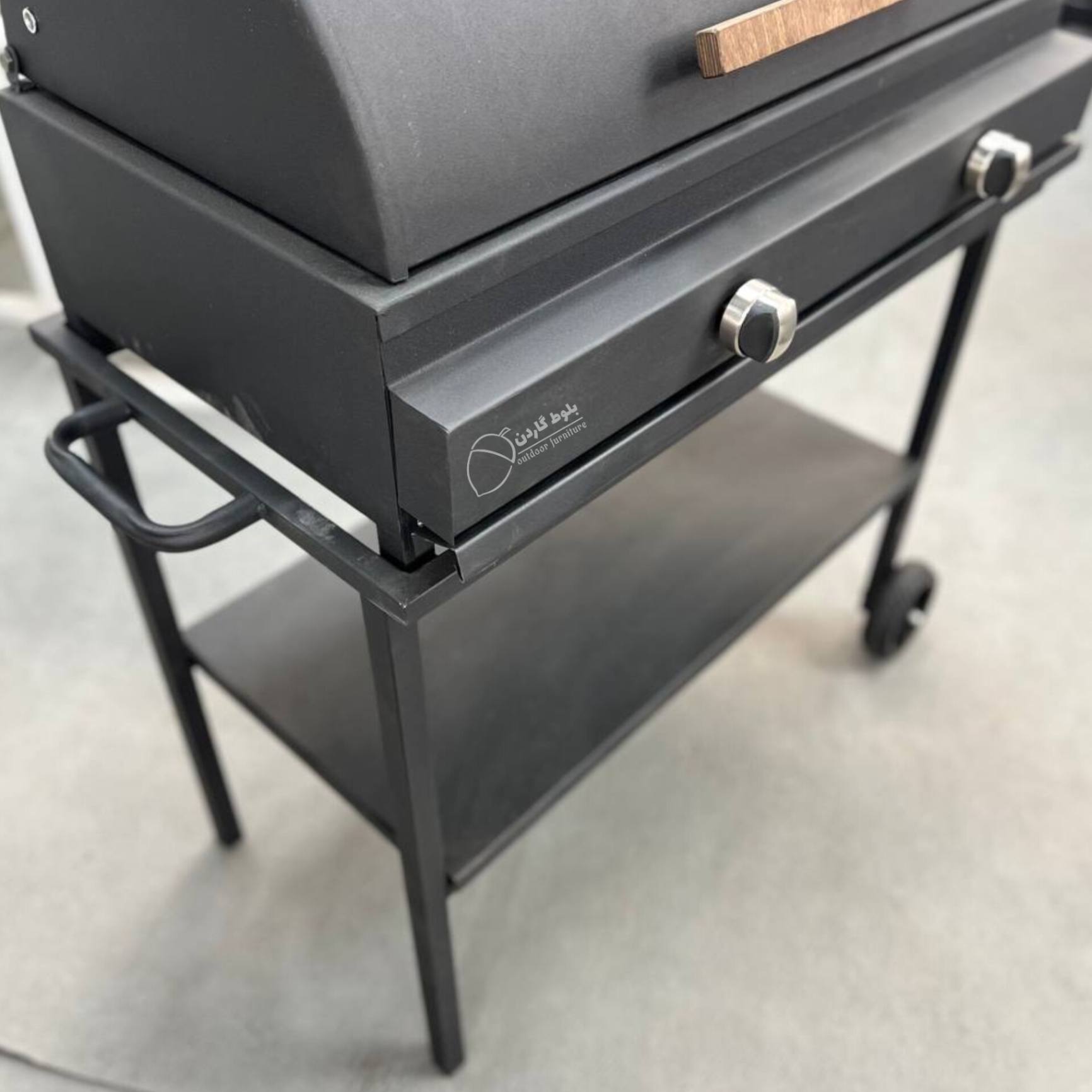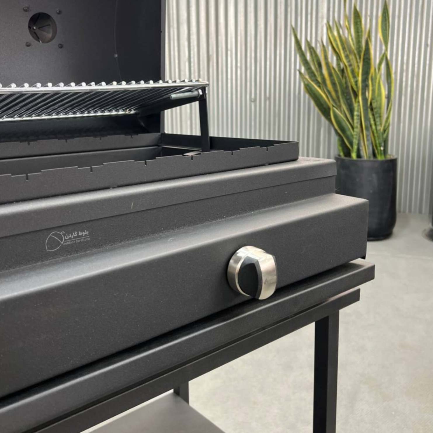 طراحی کاربردی این باربیکیو تنها به قابلیت‌های پخت‌وپز آن محدود نمی‌شود؛ طبقه پایین فضای کافی برای نگهداری سینی‌ها و سیخ‌ها را فراهم کرده و تایرهای بزرگ و مقاوم جابجایی آن را در سراسر حیاط یا تراس، فوق‌العاده آسان می‌کنند.